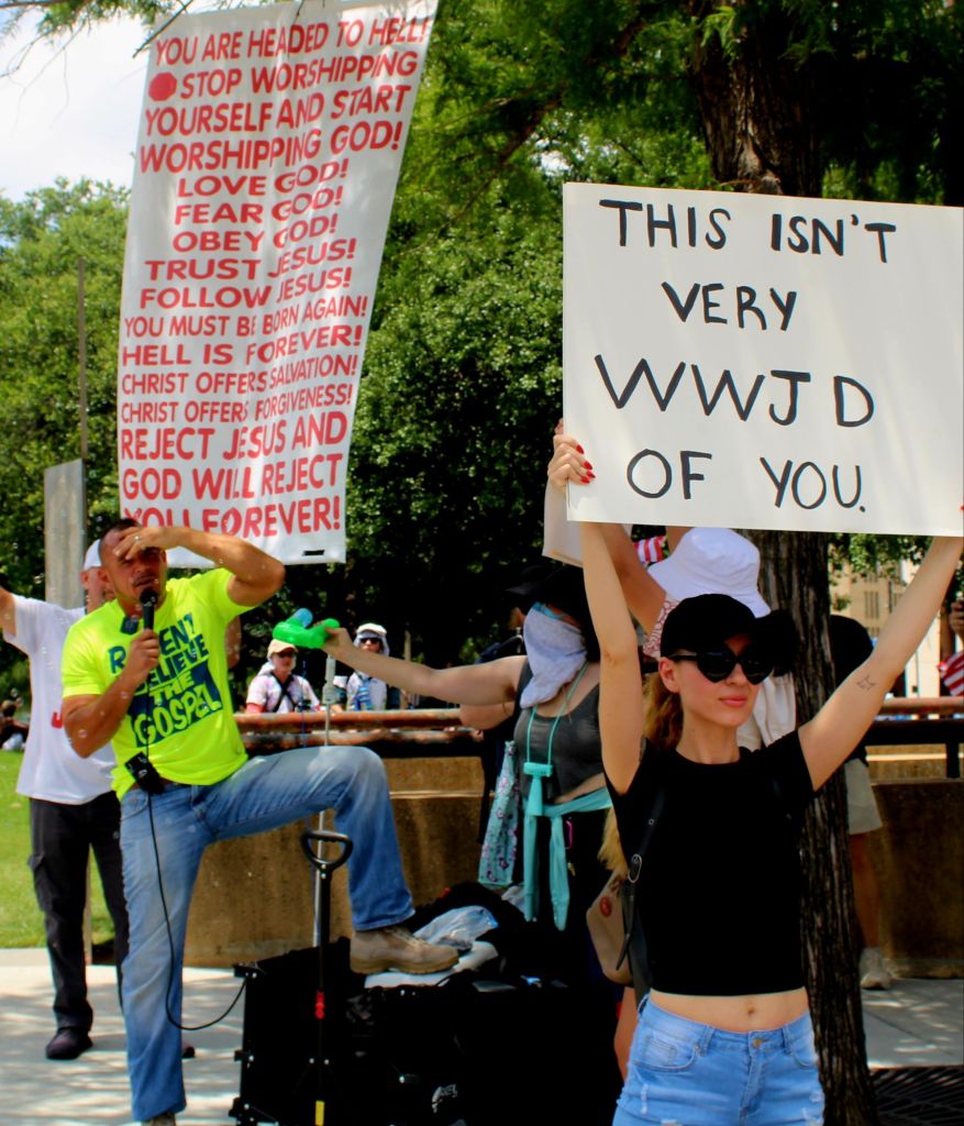 This is my fav. The dude in the yellow shirt was preaching, saying that we should kneel before our master as his god intended. He had no idea that the chick with the belly button (I guess all chicks have belly buttons) was taunting his idiocy with her sign. Blue ribbon. Gold star. Kudos, my lady.